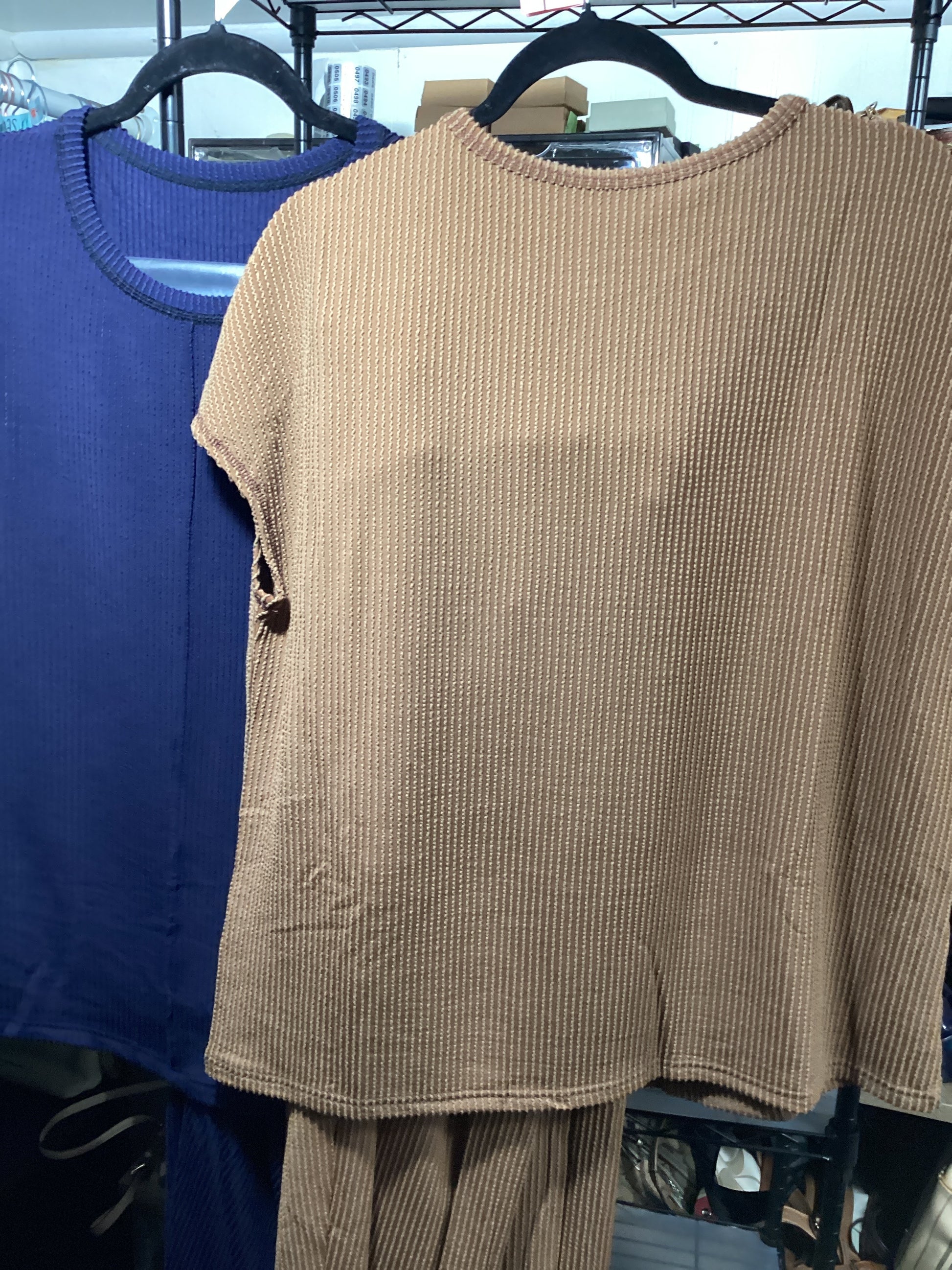 This two-piece corded set combines style with performance through its thoughtfully engineered fabric blend. The short-sleeved top features a refined round neckline, while matching pants include an adjustable drawstring waist and convenient pockets. Crafted from polyester, viscose, and elastane, this ensemble offers excellent breathability, natural drape, and stretch recovery for all-day comfort. The corded texture adds visual interest and structural integrity, making this set an ideal choice for those seeking both sophistication and practicality in their everyday rotation.
