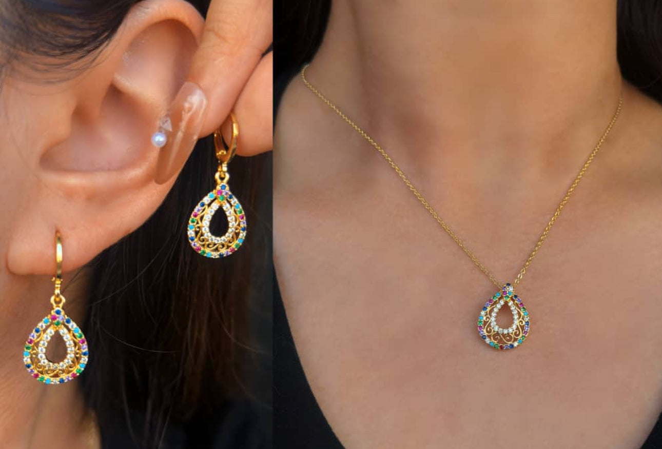 COLORFUL DROP EARRINGS, NECKLACE 20” & DROP PENDANT.